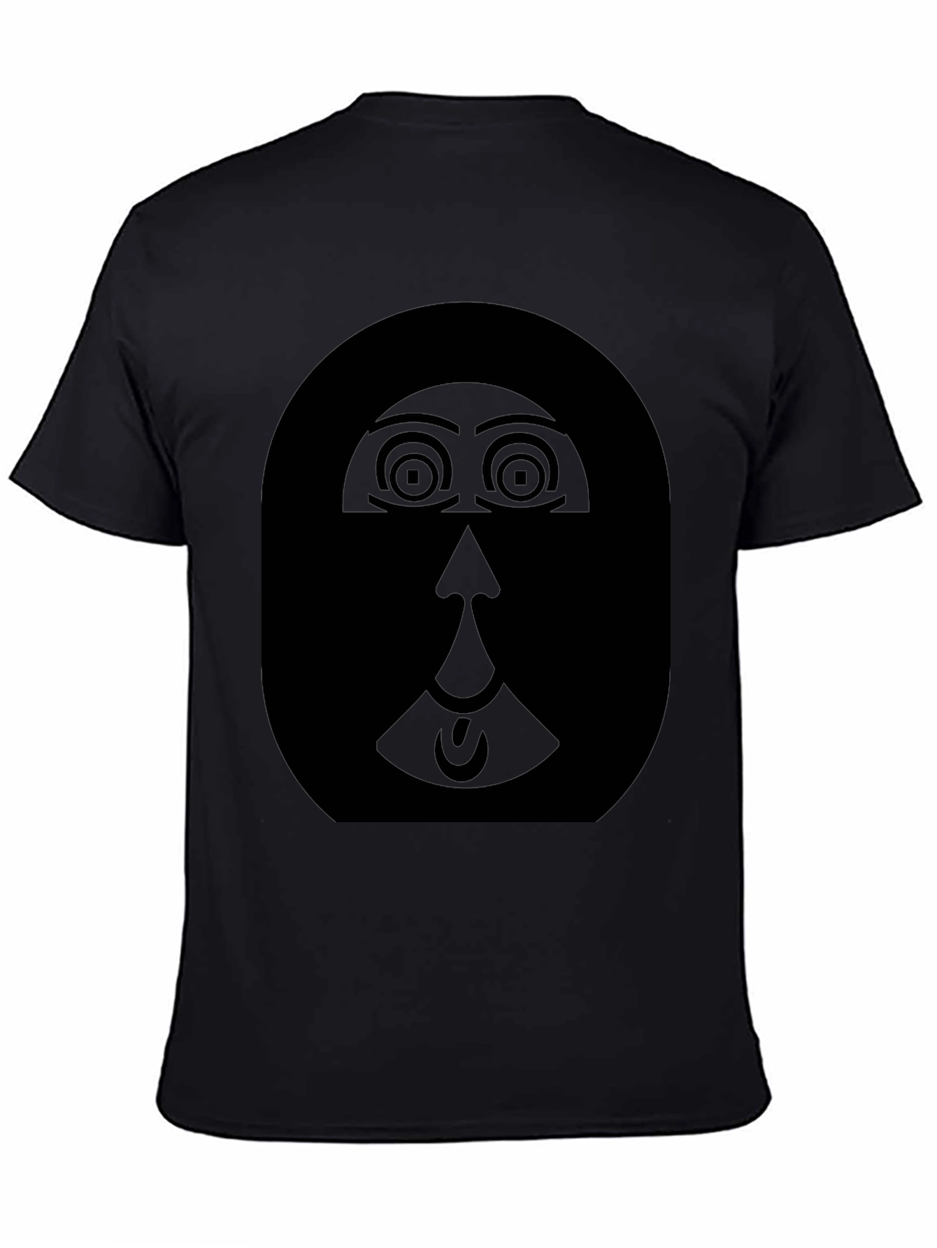 This striking black t-shirt features an abstract, stylized face graphic. The design includes geometric eyes, a minimalist nose, and a playful tongue element, all rendered in a contrasting shade against the shirt's black background. Made from a soft-looking fabric, this tee offers both comfort and style. Its eye-catching design makes it a versatile addition to any casual wardrobe. Ideal for everyday wear, music events, or expressing a unique sense of style, this t-shirt is sure to turn heads and spark conversation.