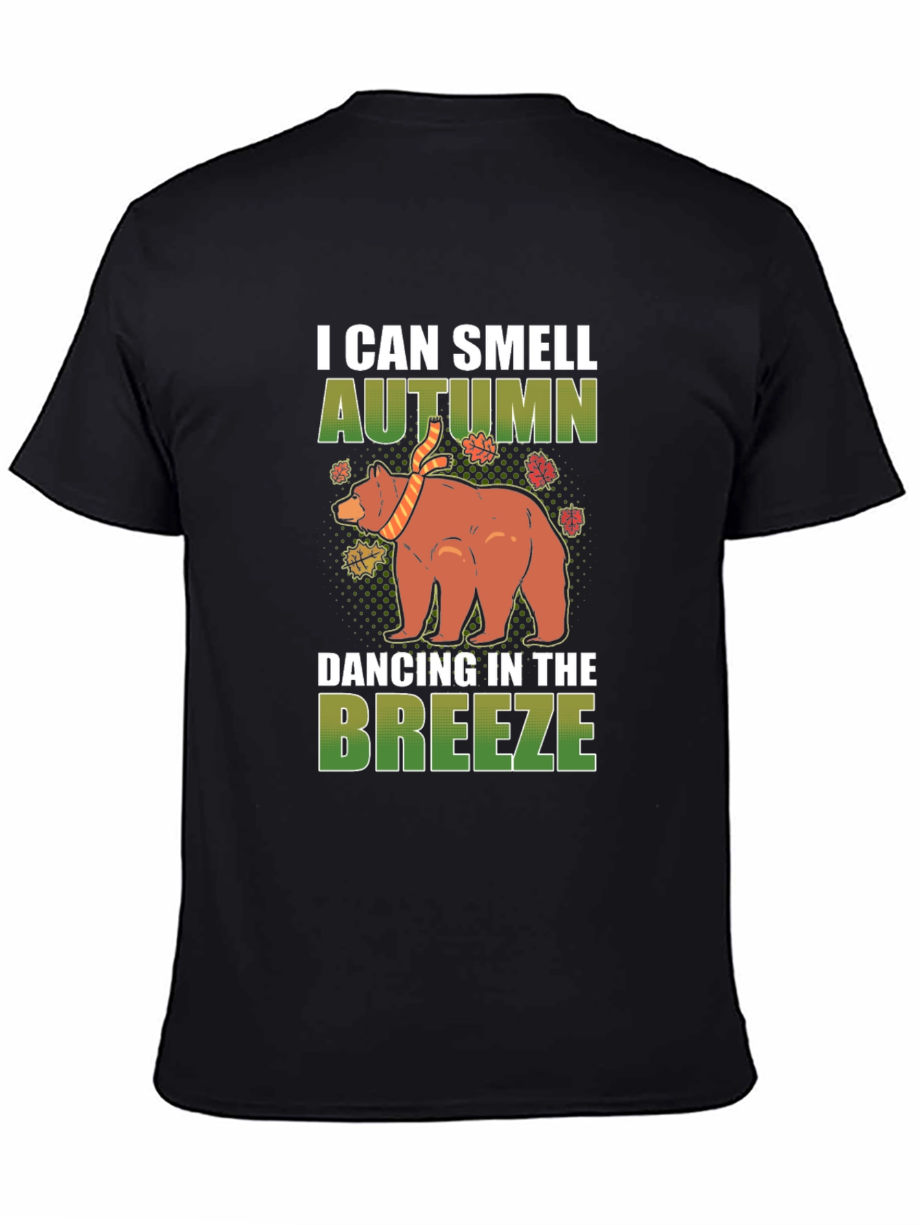 Embrace the autumn season with this cozy, comfortable t-shirt. This t-shirt features a cute bear illustration wearing a scarf, surrounded by fall leaves. The graphic is set against a backdrop of the words "I CAN SMELL AUTUMN" and "DANCING IN THE BREEZE" in a stylish gradient font. The shirt is made from a soft, breathable fabric, making it perfect for cool weather days. Wear it to your next fall festival or pumpkin patch outing. It's a must-have for autumn lovers!