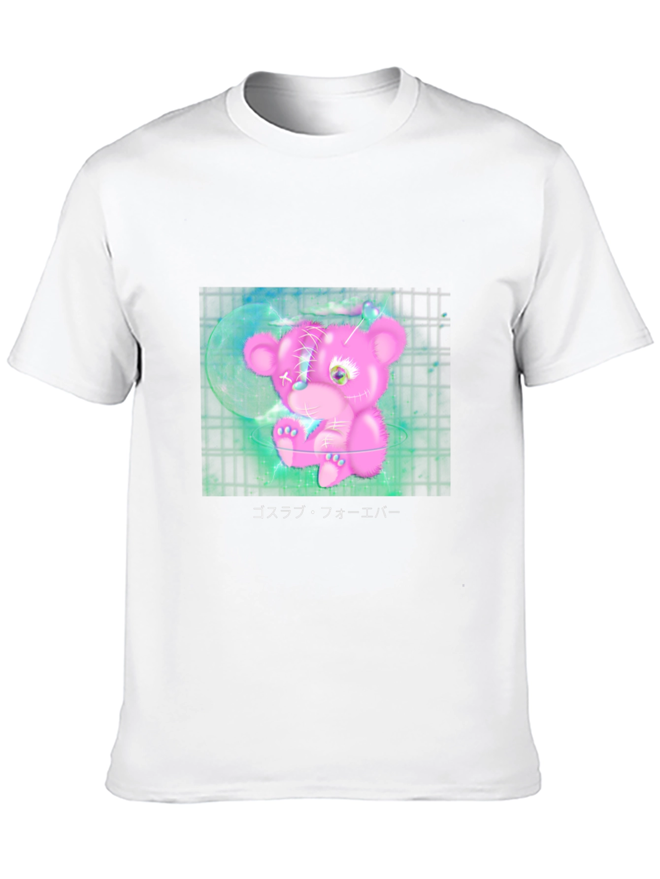 Embrace a playful yet edgy style with this black graphic t-shirt. Featuring a vibrant design of a pink teddy bear with unique stitching details, set against a cosmic backdrop with Japanese text. This tee offers a comfortable fit and a bold statement. Perfect for casual wear or as a standout piece in your streetwear collection. Its eye-catching print is sure to turn heads and spark conversations. Express your individuality and love for unique fashion with this must-have t-shirt.