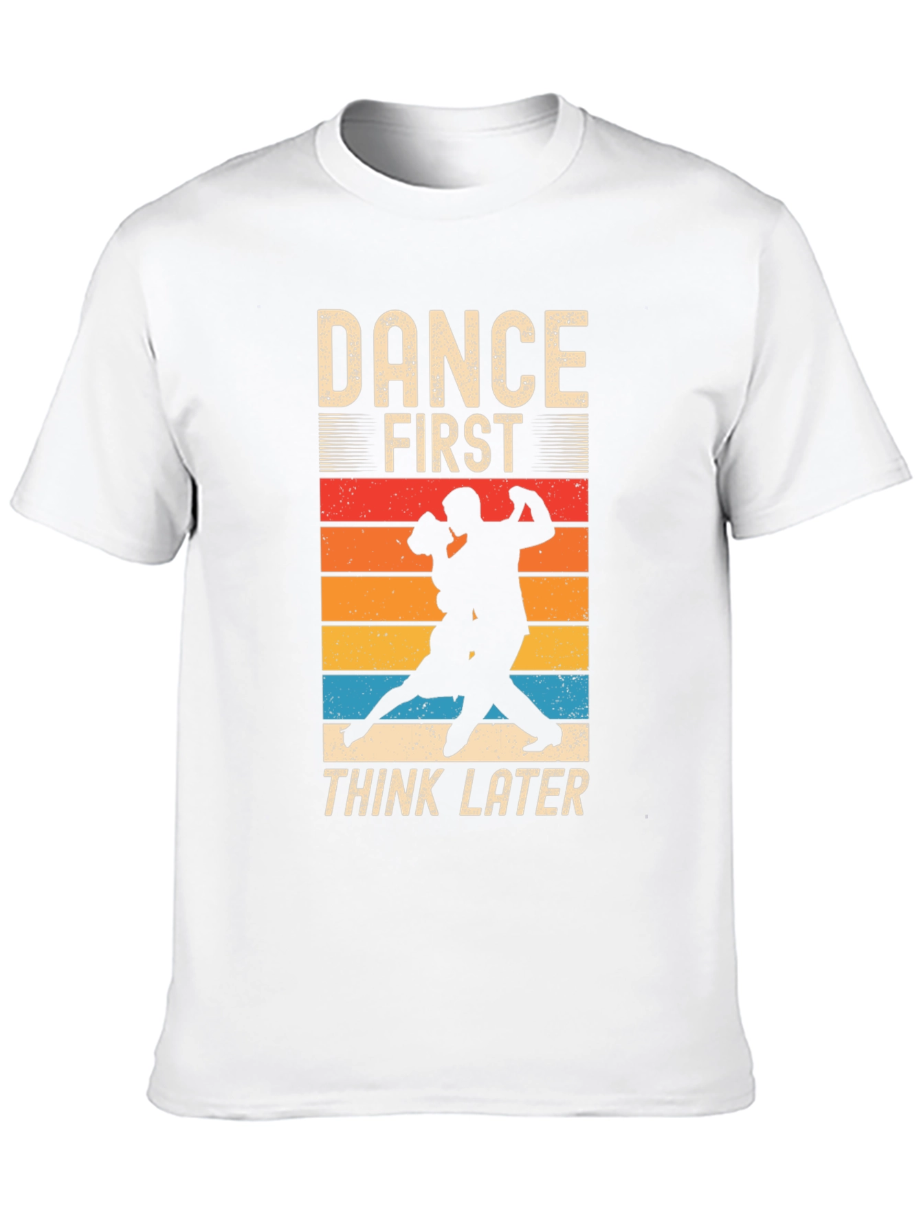 Show off your love for dancing with this stylish black t-shirt. This comfortable shirt features a retro-inspired graphic design with the phrase 'Dance First Think Later' above a silhouette of a dancing couple. The vintage sunset style background adds a trendy touch. Perfect for dance enthusiasts or anyone who loves to make a statement with their clothing, this tee is ideal for casual outings, dance classes, or simply relaxing at home. Express yourself and let your passion for dance shine through!