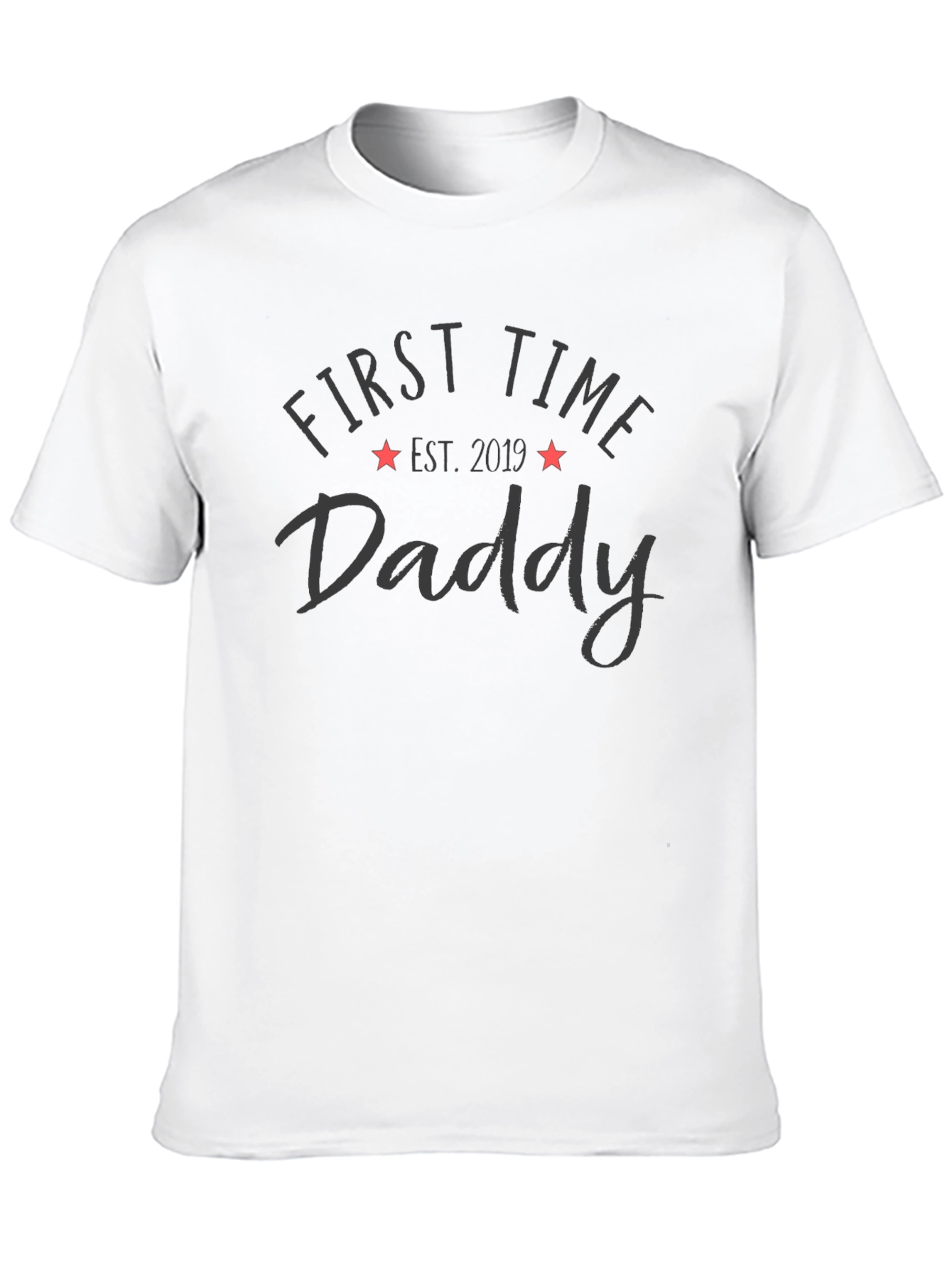 Celebrate becoming a new dad with this stylish black t-shirt. Featuring the words 'First Time Daddy' and 'Est. 2019' in a subtle gray font, this shirt is perfect for showing off your new role. The stars on each side of the year add an extra touch of flair. Made from soft, breathable fabric, it's comfortable enough for everyday wear. Whether you're running errands or spending quality time with your little one, this t-shirt is a great way to announce your proud papa status. A perfect gift for new dads!