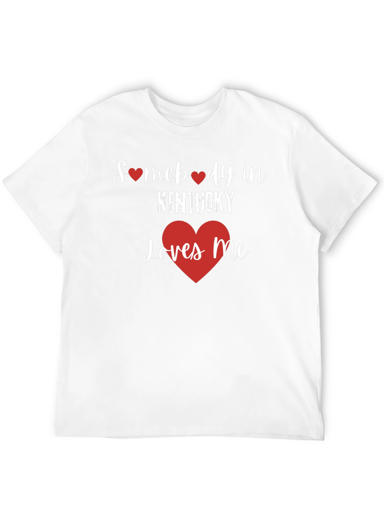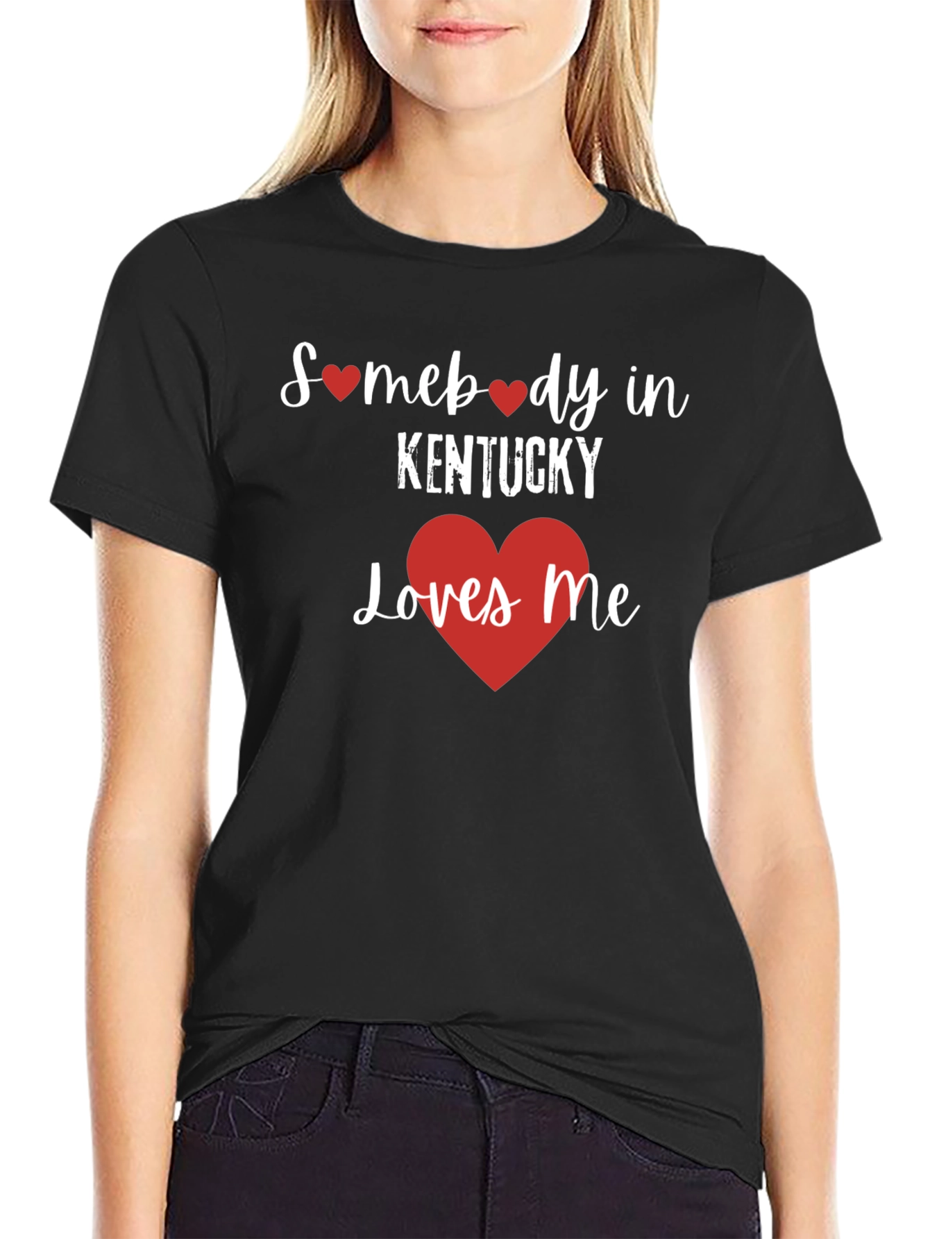 Show your love for Kentucky with this classic black graphic t-shirt. The shirt features a charming design with the text "Somebody in Kentucky Loves Me", adorned with red heart accents. Crafted from a comfortable, breathable fabric, this tee offers a relaxed fit perfect for everyday wear. The design is printed with high-quality inks to ensure long-lasting vibrancy. Whether you're a proud Kentuckian or simply want to show some love for the state, this t-shirt is a stylish and comfortable way to do it. Ideal for casual outings, sporting events, or simply lounging at home.