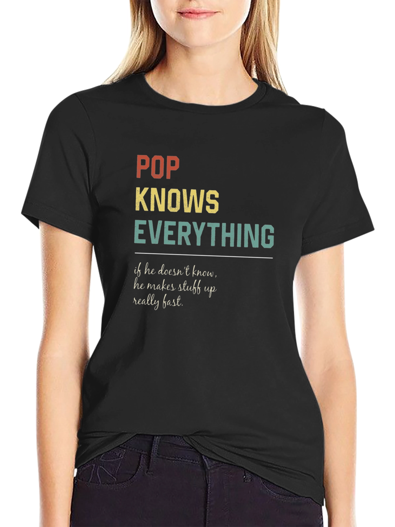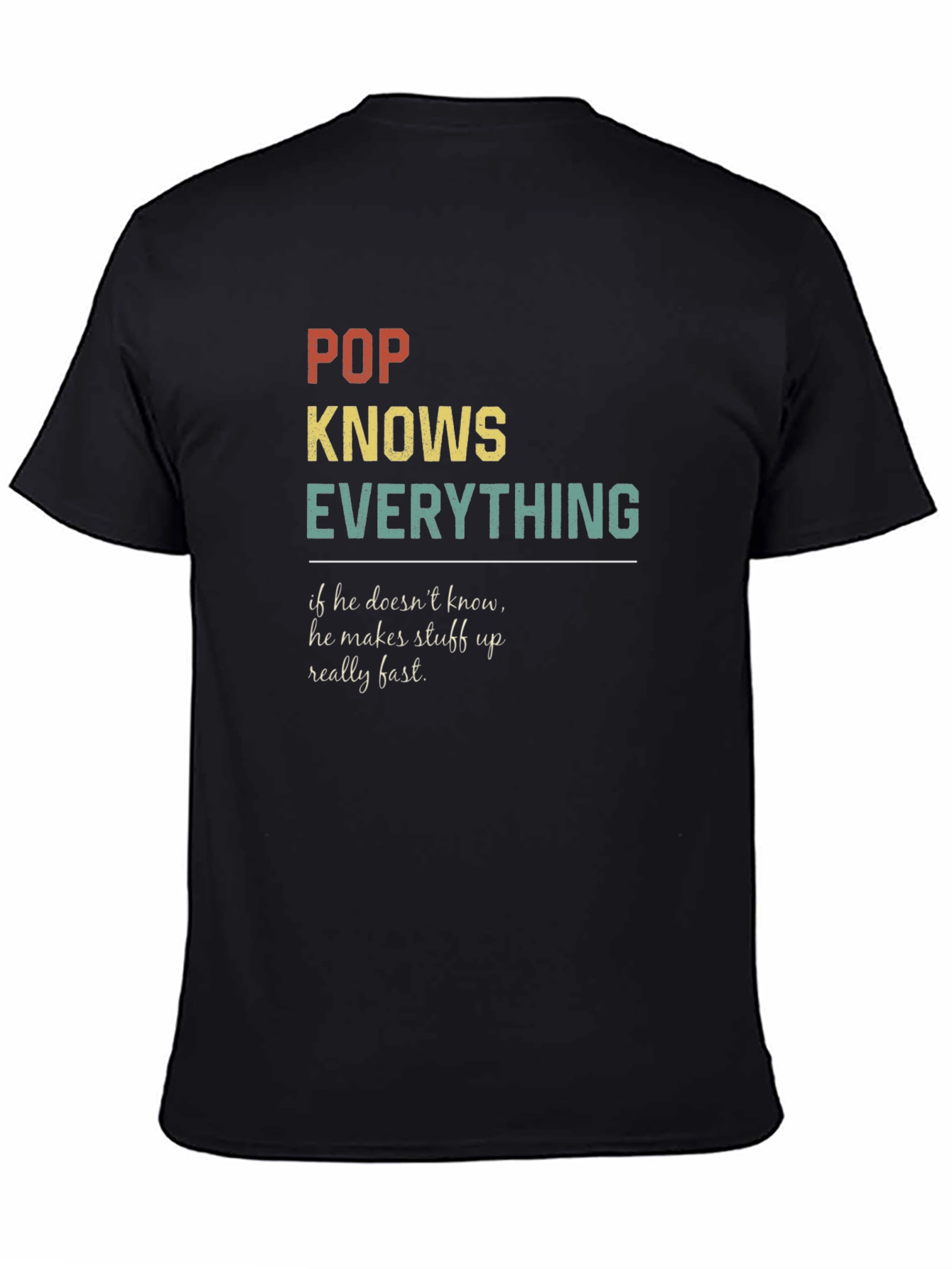 This black t-shirt features a humorous and endearing design, perfect for the beloved 'Pop' in your life. The shirt displays the text "POP KNOWS EVERYTHING" in a retro-inspired font and color palette, with 'POP' in a faded brick red, 'KNOWS' in golden yellow, and 'EVERYTHING' in a vintage teal. Beneath a thin line, the phrase "if he doesn't know, he makes stuff up really fast." is printed in a smaller, elegant font. The design suggests a fun, lighthearted personality and a close family bond. Ideal for casual wear, family gatherings, or as a thoughtful gift to celebrate a special grandfather figure.