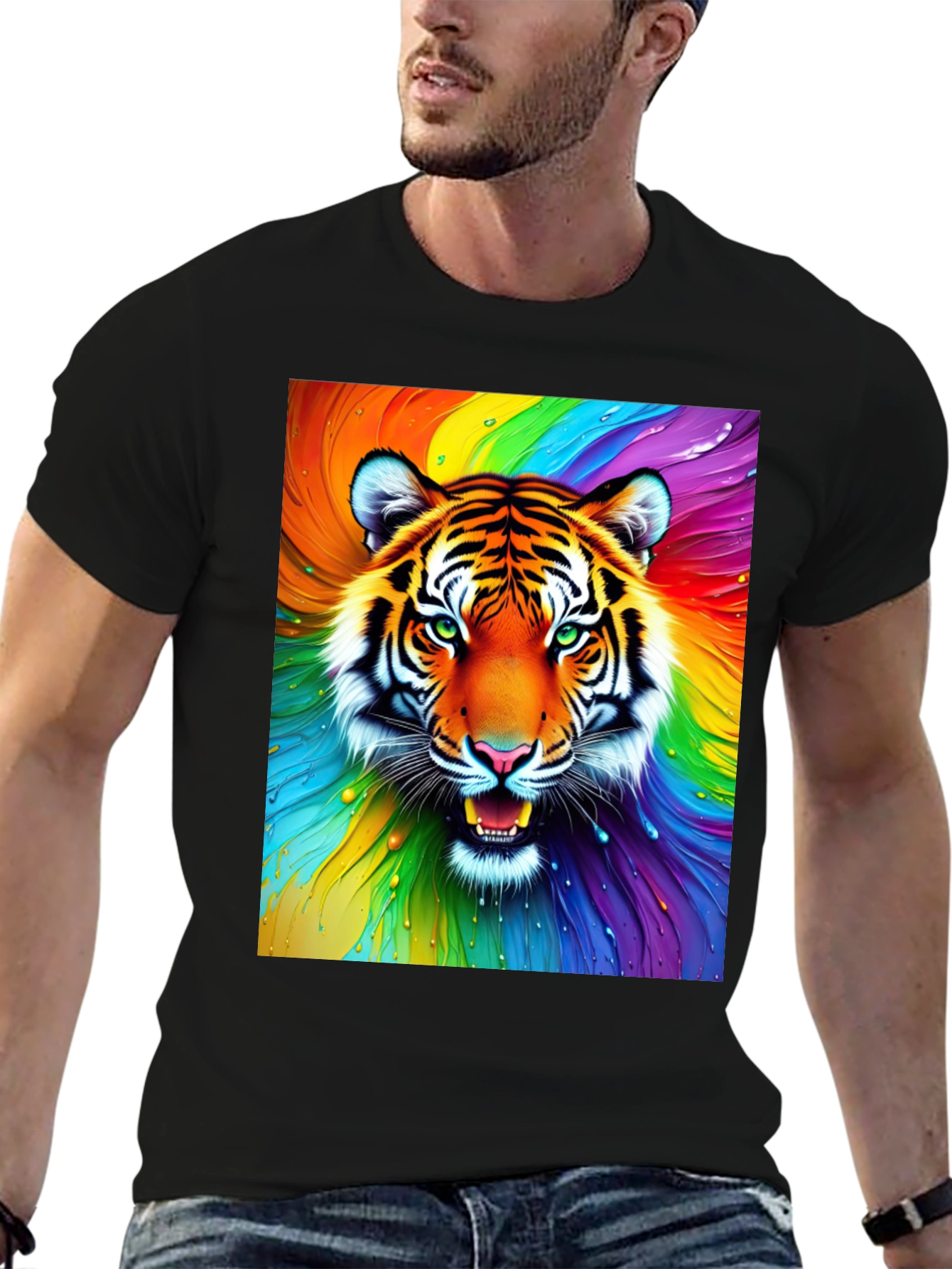 Make a statement with this eye-catching black t-shirt featuring a vibrant, rainbow-colored tiger graphic. The design showcases a majestic tiger head surrounded by swirling hues of the rainbow. This unique and striking design is sure to turn heads. The shirt appears to be made from a soft and comfortable material, perfect for everyday wear. This tee is ideal for casual outings, concerts, or as a standout piece in your wardrobe. Express your wild side with this must-have graphic tee!