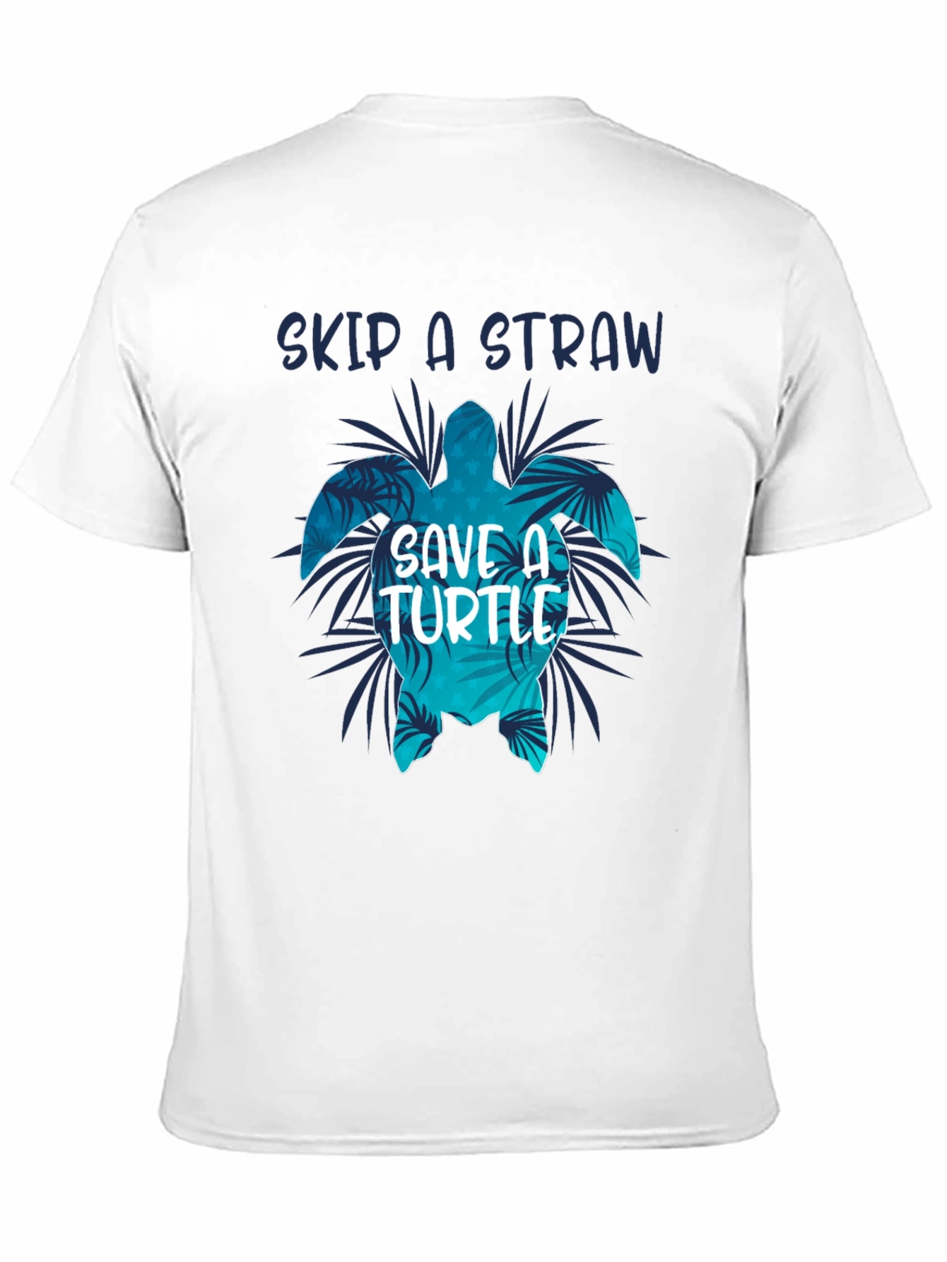 Show your love for turtles with this unique tee! This black t-shirt features a vibrant blue turtle graphic filled with a tropical leaf pattern, promoting environmental awareness. Above the turtle are the words "Skip A Straw" and below the turtle are the words "Save A Turtle", both in a matching blue font. Ideal for casual wear, environmental activists, or anyone who cares about ocean conservation. Comfortable and stylish, it's the perfect way to make a statement and support a great cause. Get yours today and help protect our sea turtles!