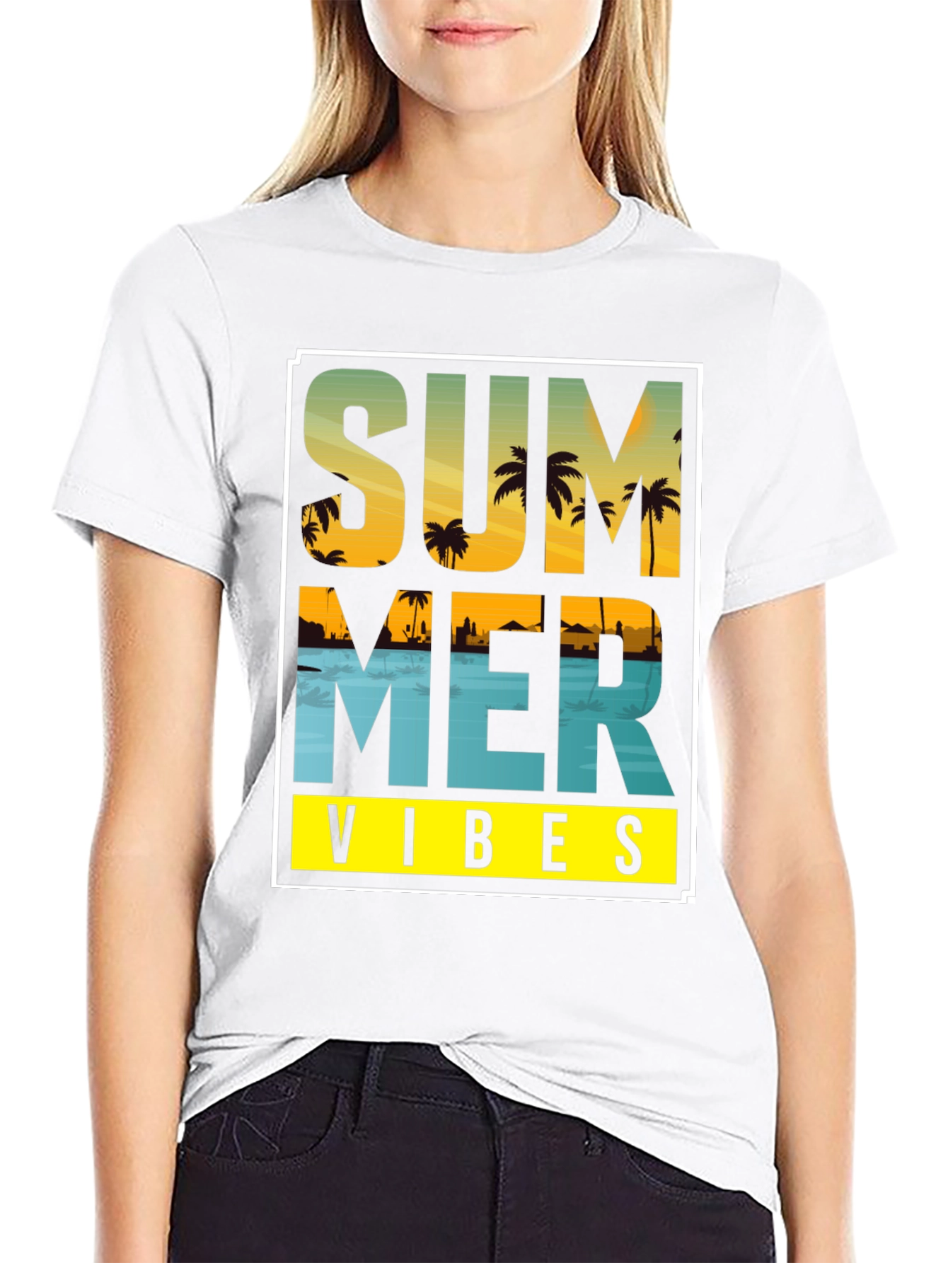Embrace the summer spirit with this stylish black graphic t-shirt. The design features a vibrant 'SUMMER VIBES' text filled with island imagery. Palm trees silhouetted against a colorful sunset evokes a relaxing beach atmosphere. The shirt is made of a soft material, likely cotton or a blend, offering comfort and breathability for warm weather. The print is framed by a crisp white border, adding a modern touch. Ideal for casual outings, beach trips, or summer parties, this tee is a must-have for anyone who loves the sun and sand. Show off your summer state of mind with this eye-catching tee!