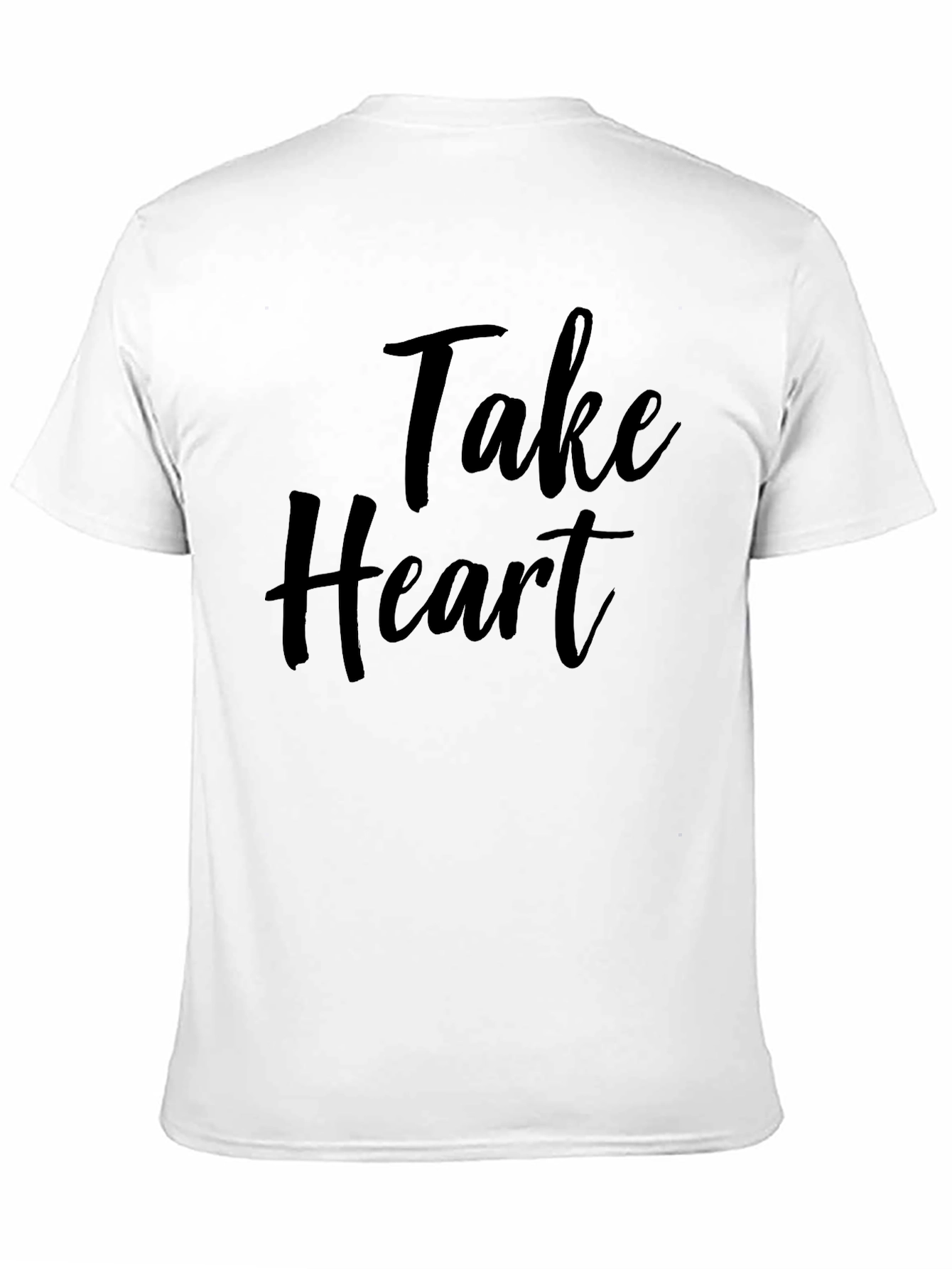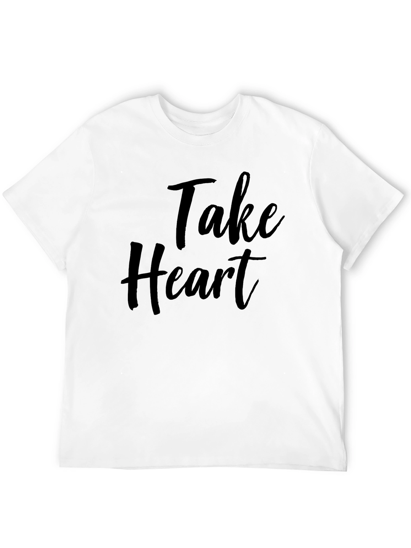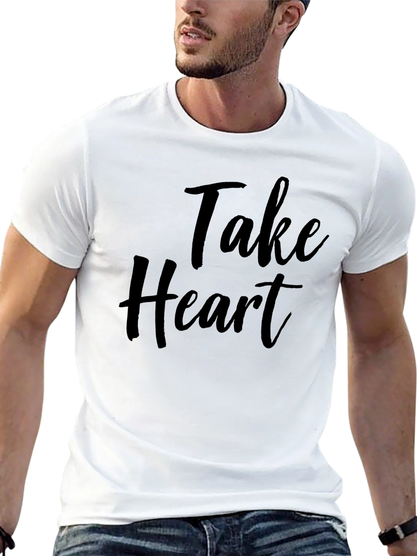 Showcase your inspirational side with this stylish black t-shirt. The shirt features the words 'Take Heart' in a classy, handwritten-style font. This shirt is perfect for everyday wear. The classic fit ensures maximum comfort and a flattering silhouette. Made from soft, breathable fabric, this tee feels great against the skin and is ideal for casual outings, workouts, or just lounging at home. Pair it with jeans, shorts, or your favorite bottoms for a trendy and motivational look. Be bold and 'Take Heart' with your day!