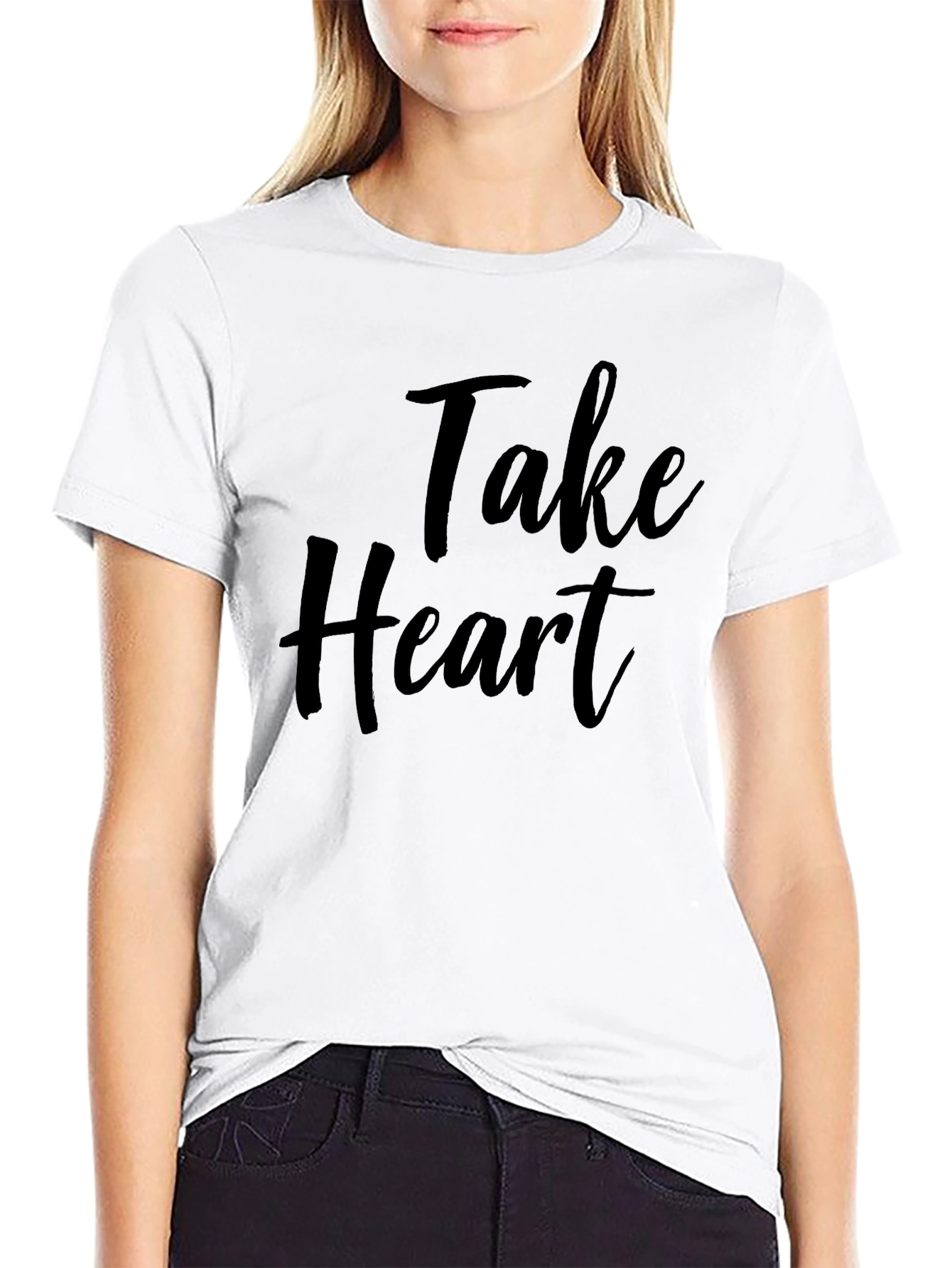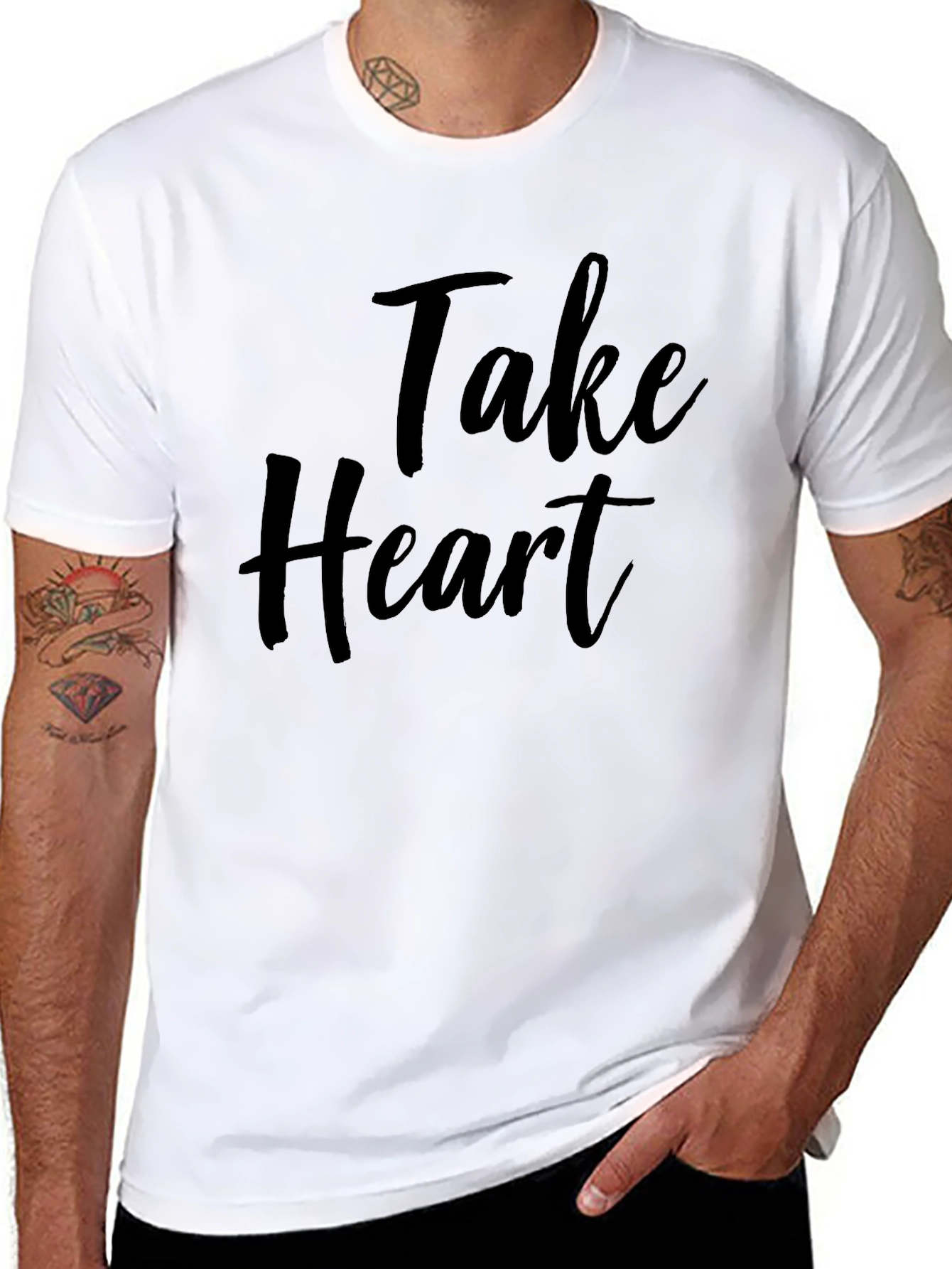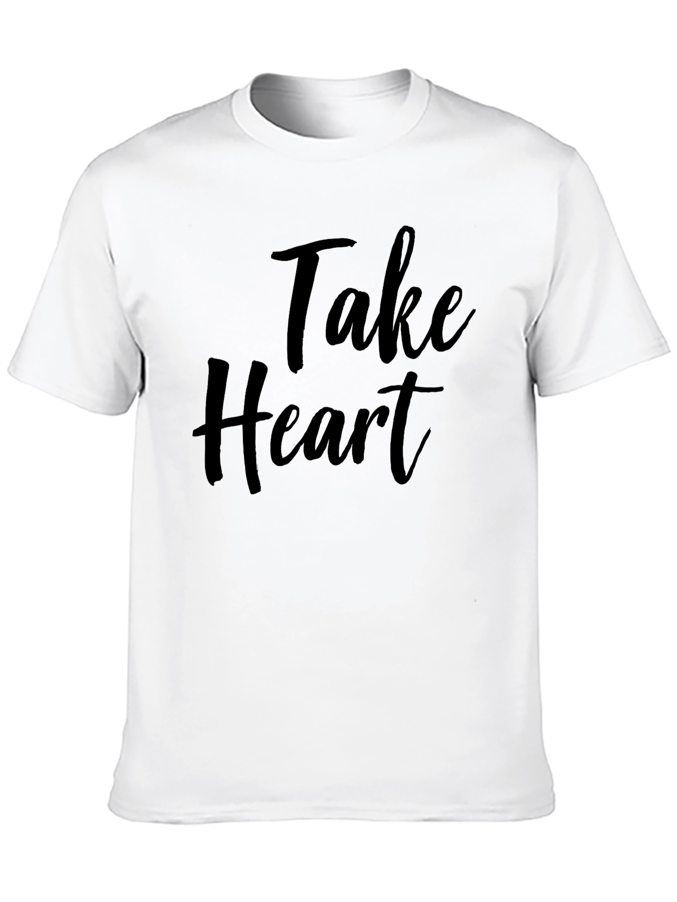 Showcase your inspirational side with this stylish black t-shirt. The shirt features the words 'Take Heart' in a classy, handwritten-style font. This shirt is perfect for everyday wear. The classic fit ensures maximum comfort and a flattering silhouette. Made from soft, breathable fabric, this tee feels great against the skin and is ideal for casual outings, workouts, or just lounging at home. Pair it with jeans, shorts, or your favorite bottoms for a trendy and motivational look. Be bold and 'Take Heart' with your day!