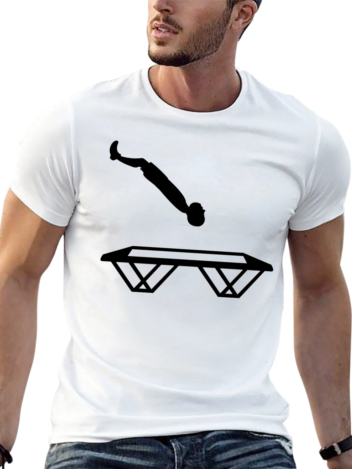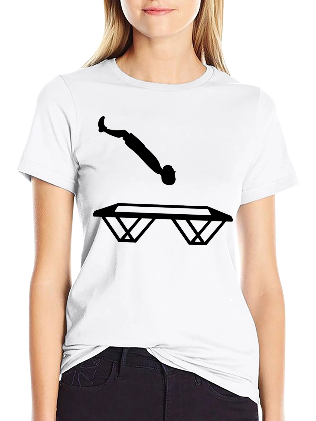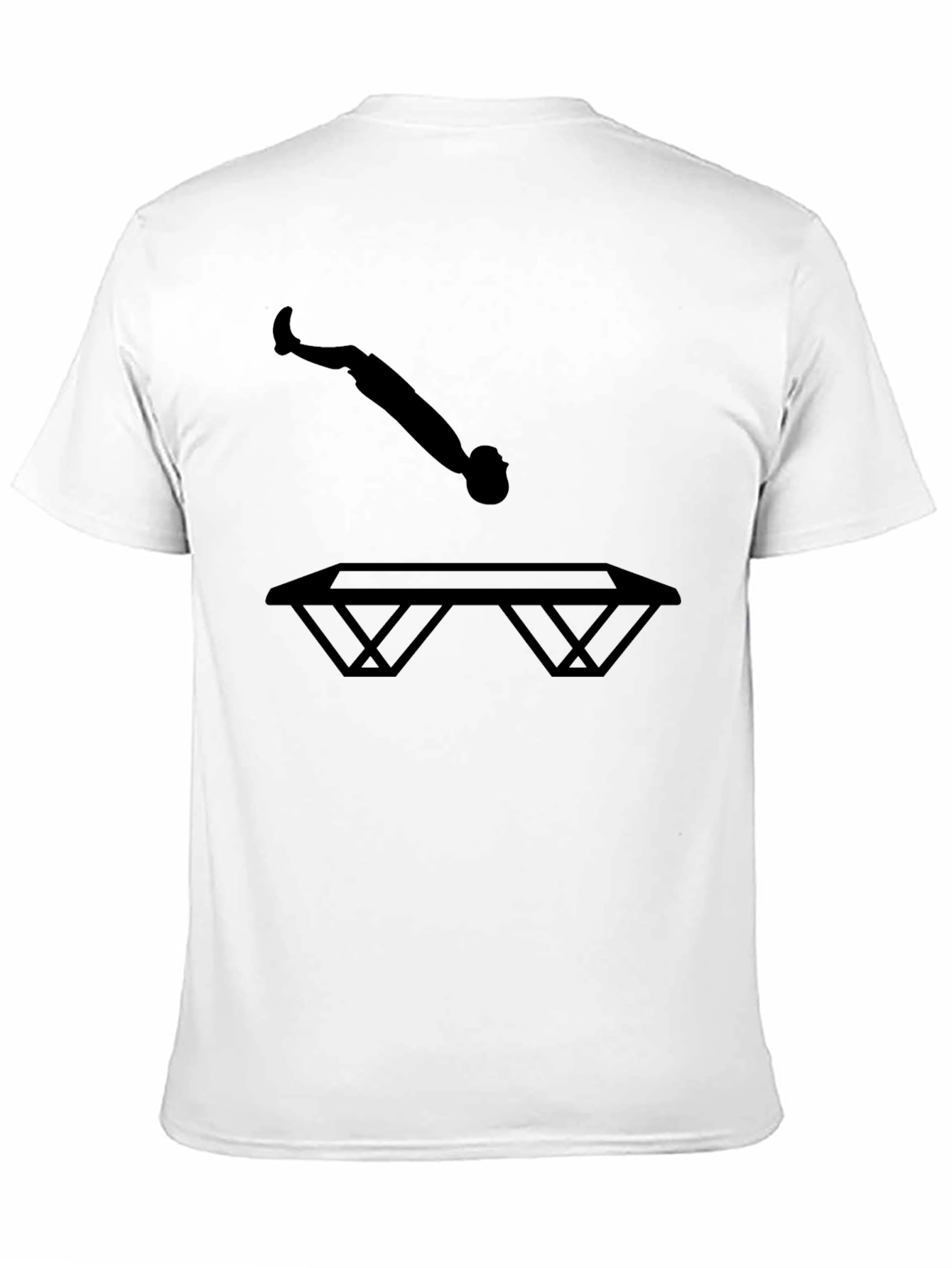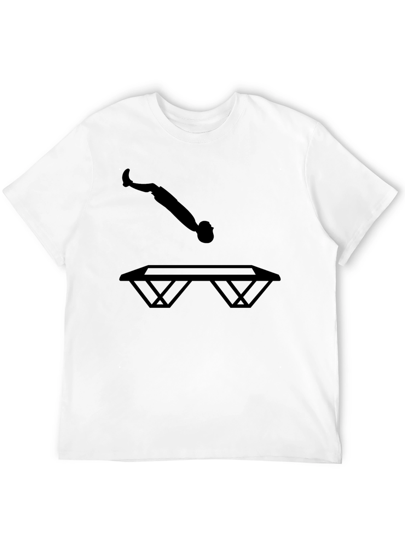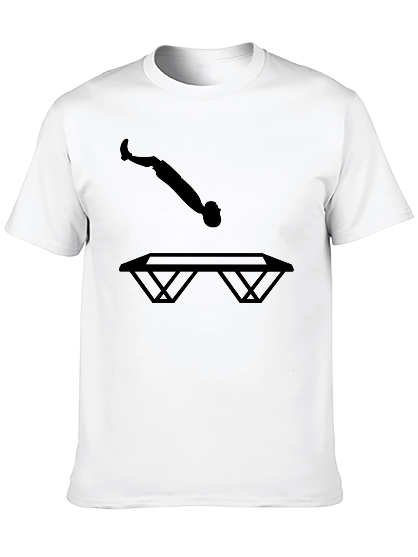 Show off your love for trampolining with this stylish black t-shirt! Featuring a bold silhouette of a person in mid-jump above a trampoline, this tee is perfect for athletes, gymnasts, and anyone who loves fun and fitness. The striking graphic makes a statement, while the classic black color ensures it pairs effortlessly with any outfit. Wear it to the gym, trampoline park, or just out and about to express your passion. Made from a comfortable material, this tee ensures a great fit and feel all day long. Add it to your wardrobe and bounce into action!