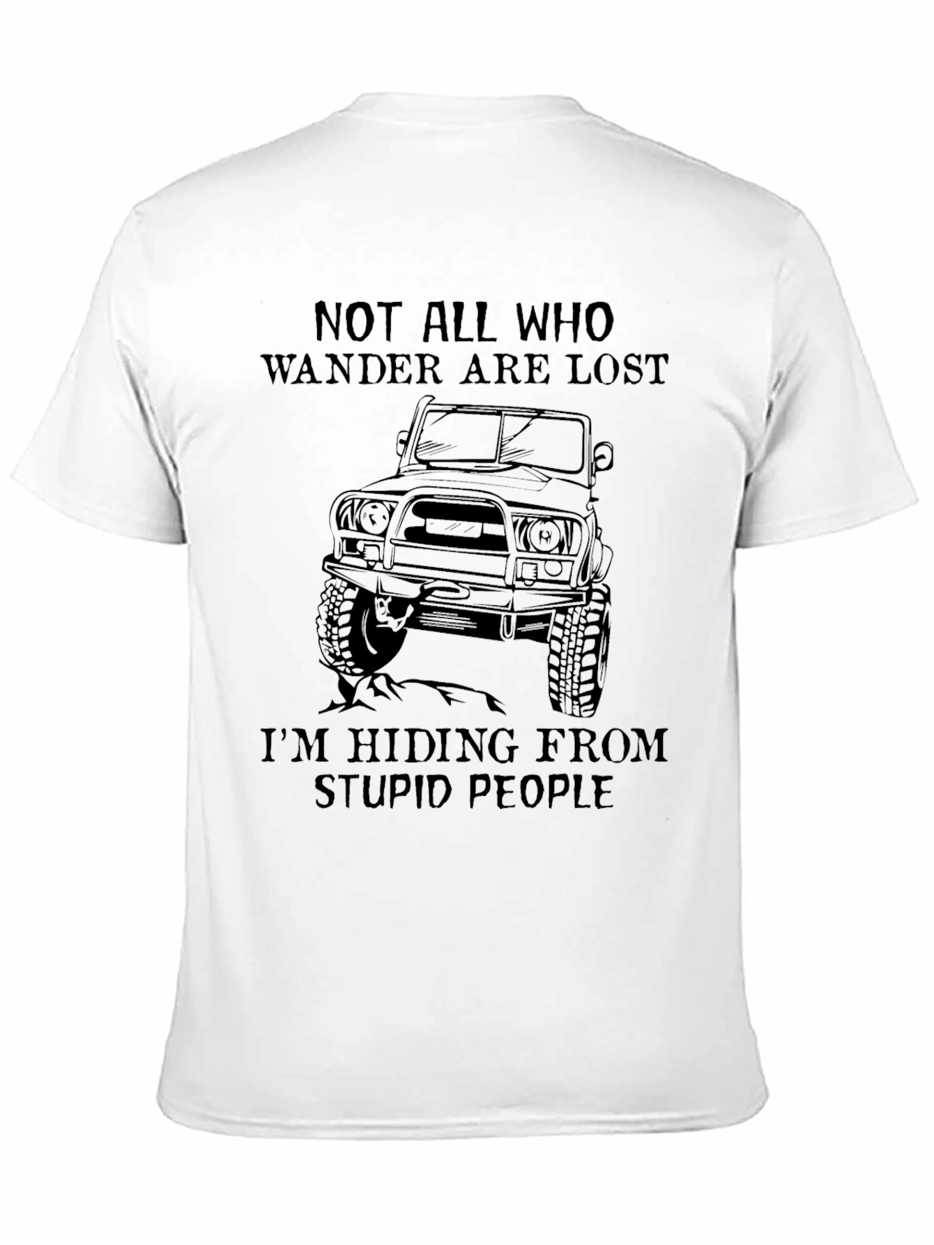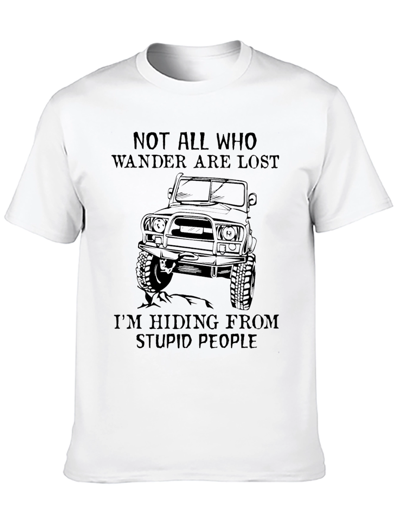 Show your adventurous side with this black graphic tee! The shirt features the humorous statement 'Not All Who Wander Are Lost. I'm Hiding From Stupid People' along with an illustration of an off-road vehicle, perfect for those who love exploring the outdoors. Made from a comfortable material, this tee is ideal for casual wear, hiking, camping, or just relaxing. Whether you're hitting the trails or running errands, this shirt is sure to make a statement and spark conversation. A must-have for any outdoor enthusiast with a sense of humor!